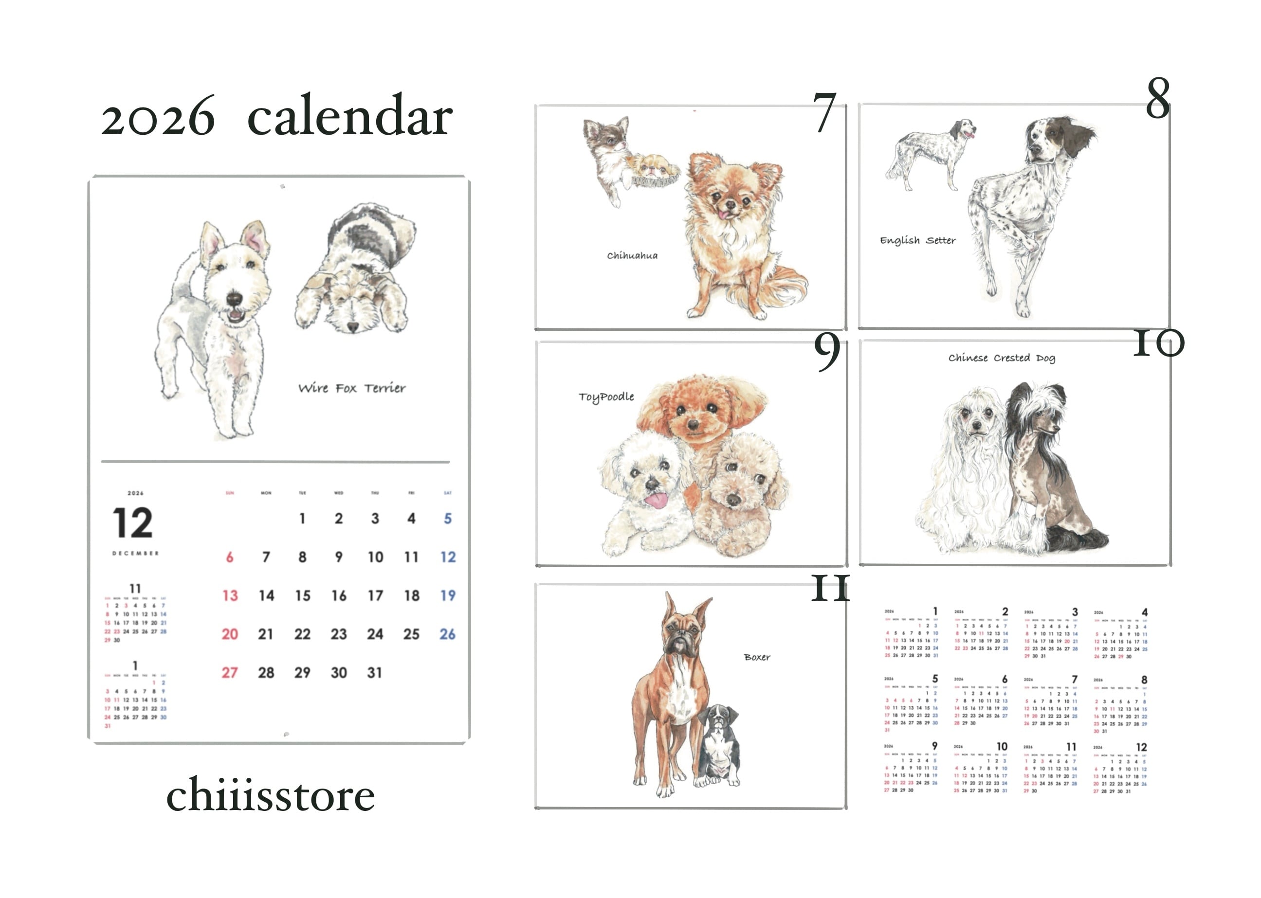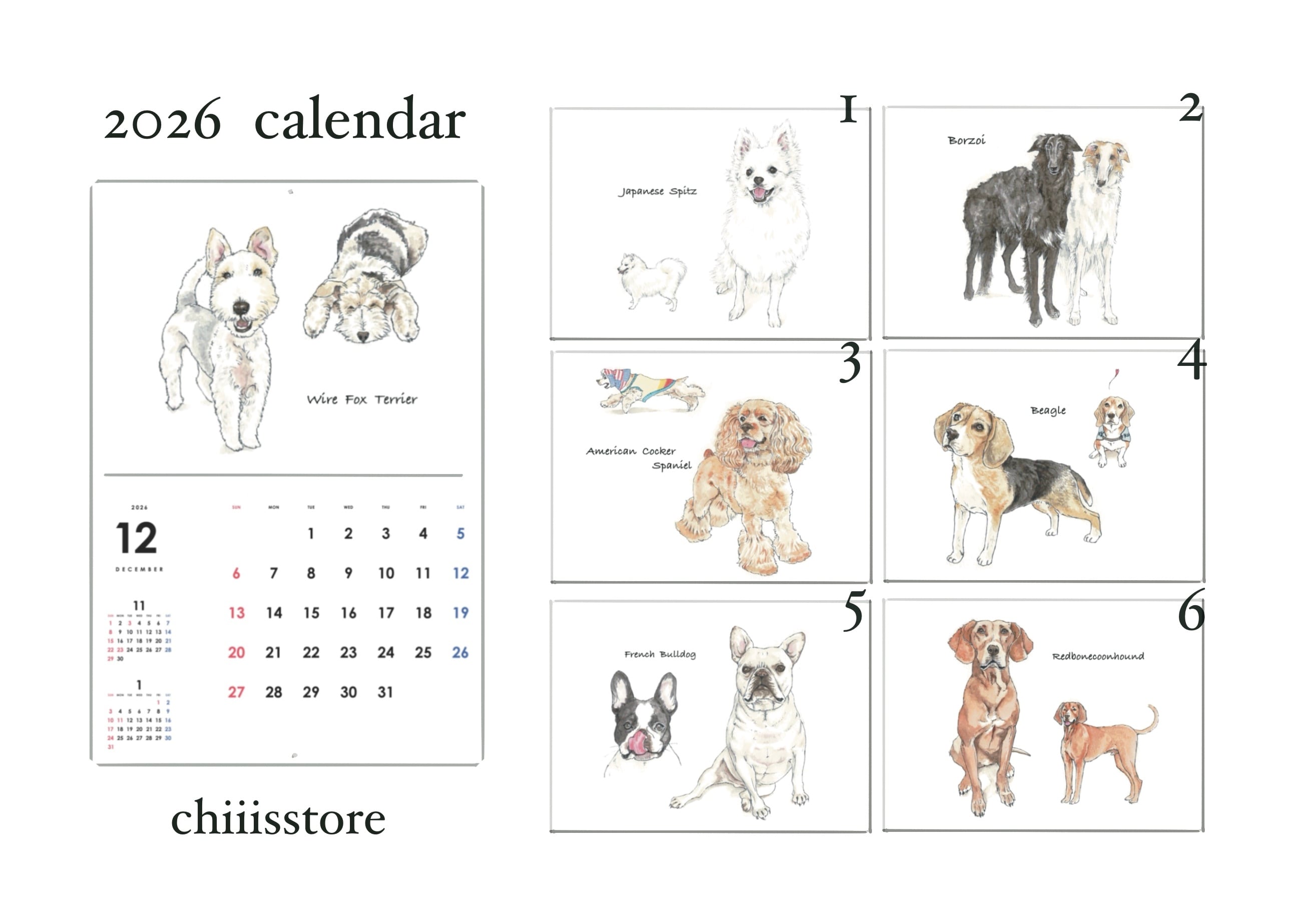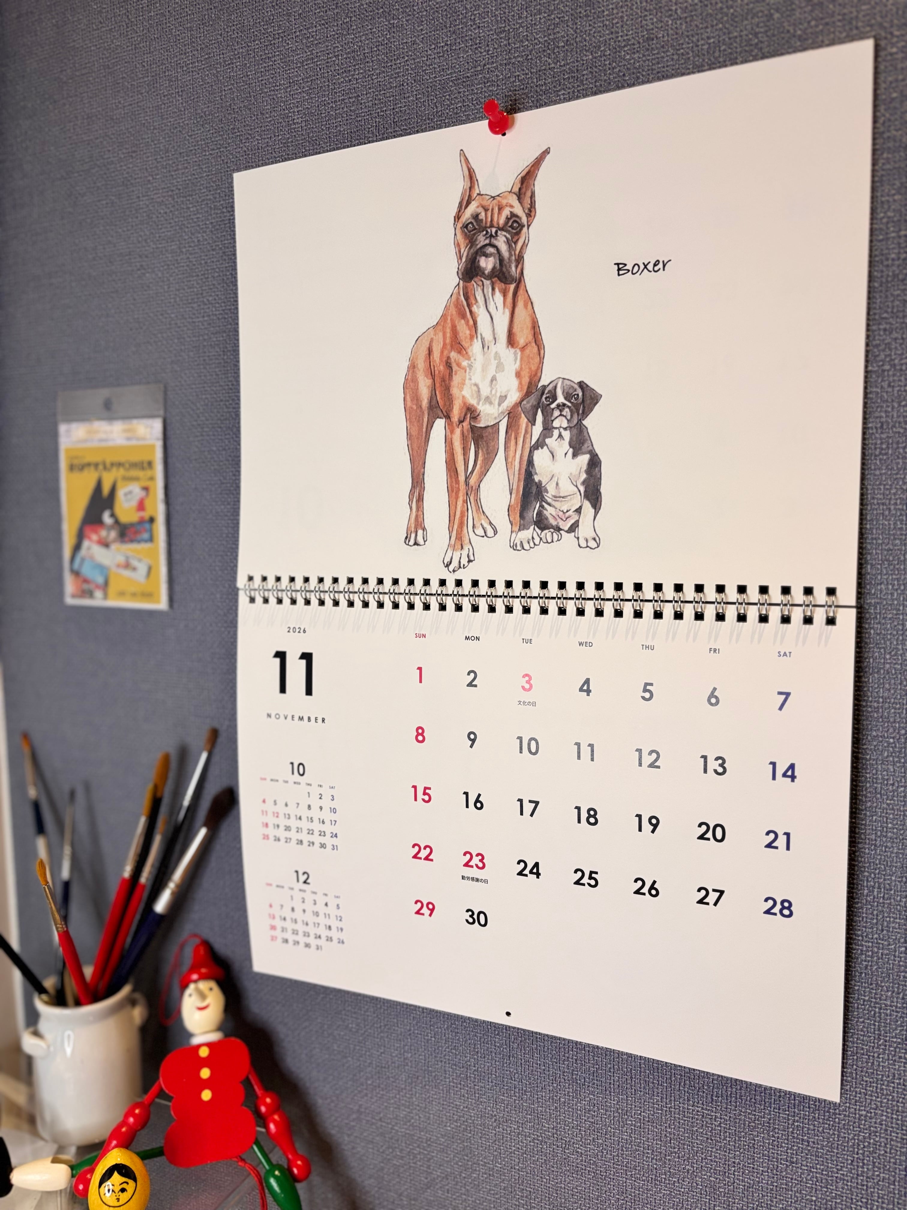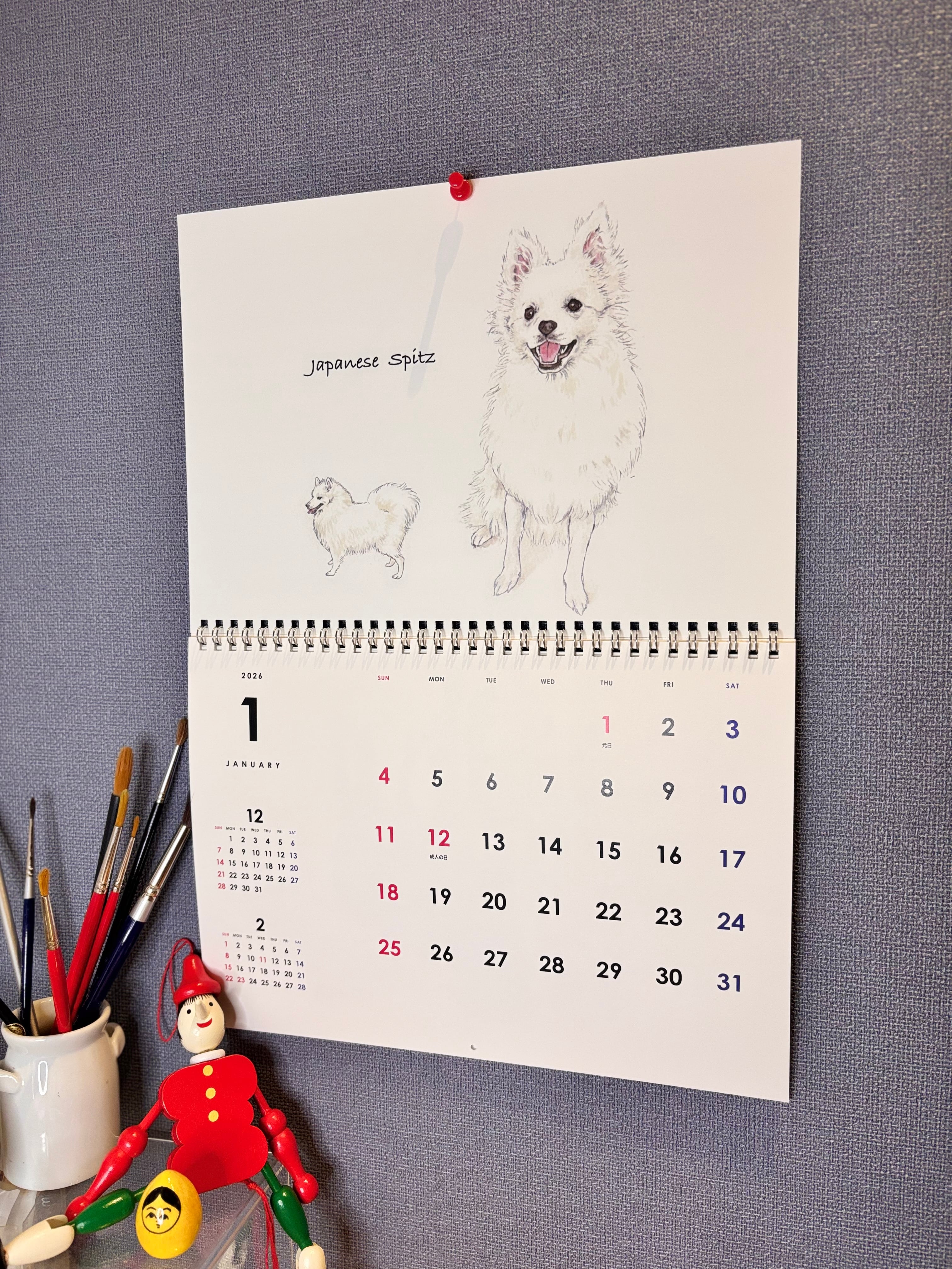 見やすいサイズで、スケジュール管理にも便利な壁掛けのカレンダーです。月ごとの犬のイラストが華やかに彩り、インテリアにもぴったりです。