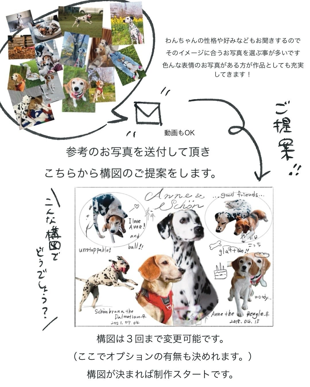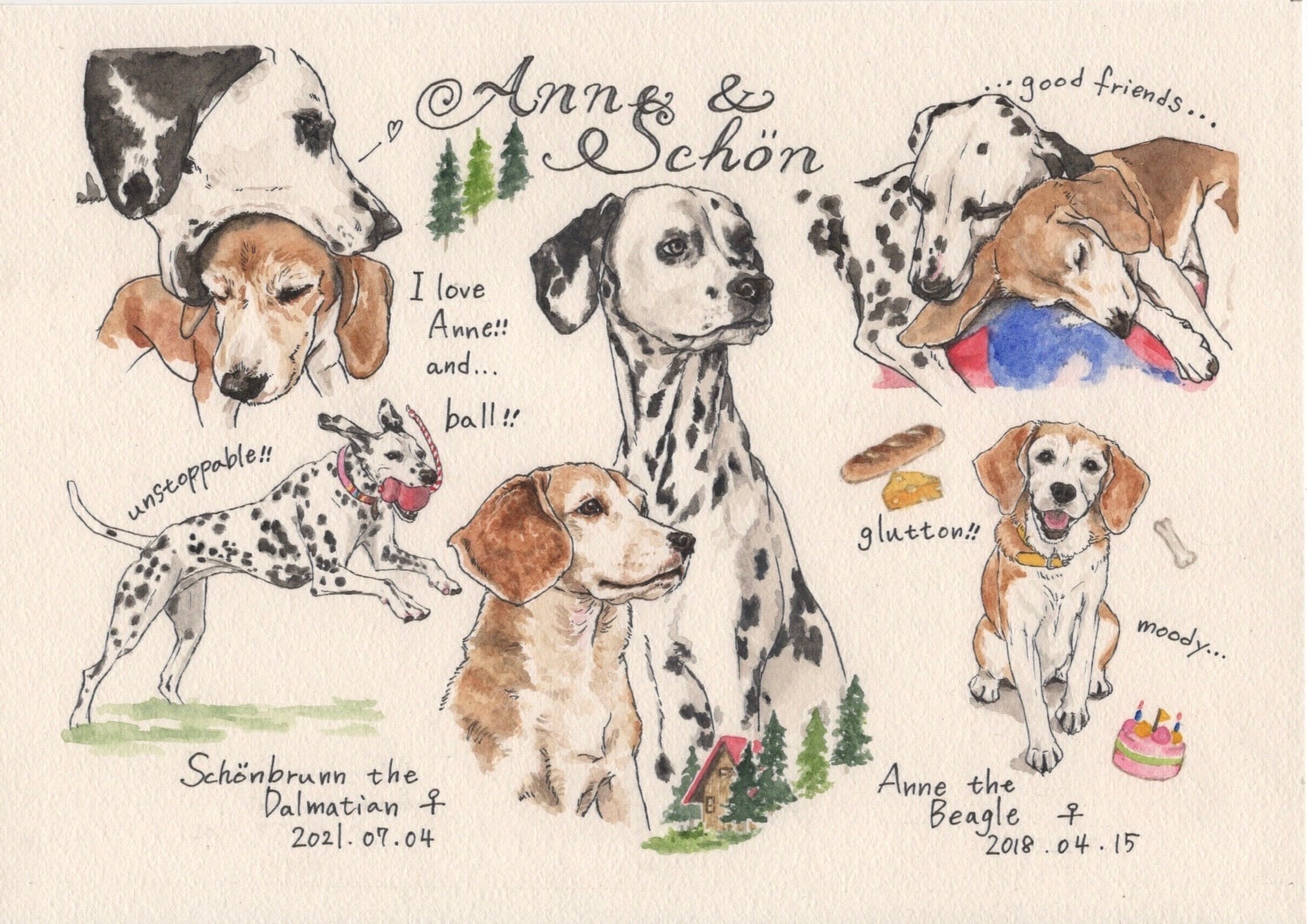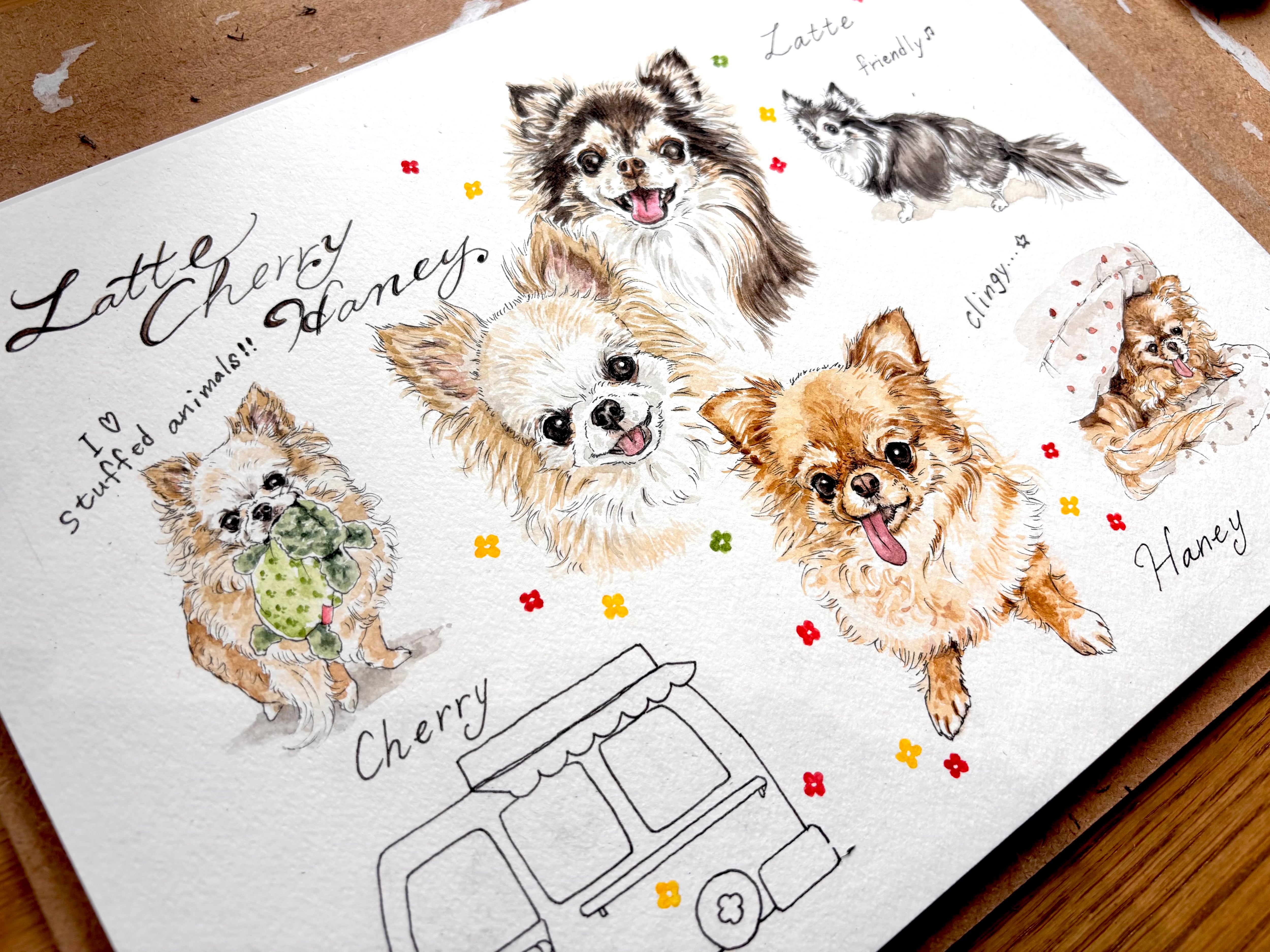 メインのイラストを中心に愛犬の普段の姿や個々の性格がわかるようなイラストを数点描きます。